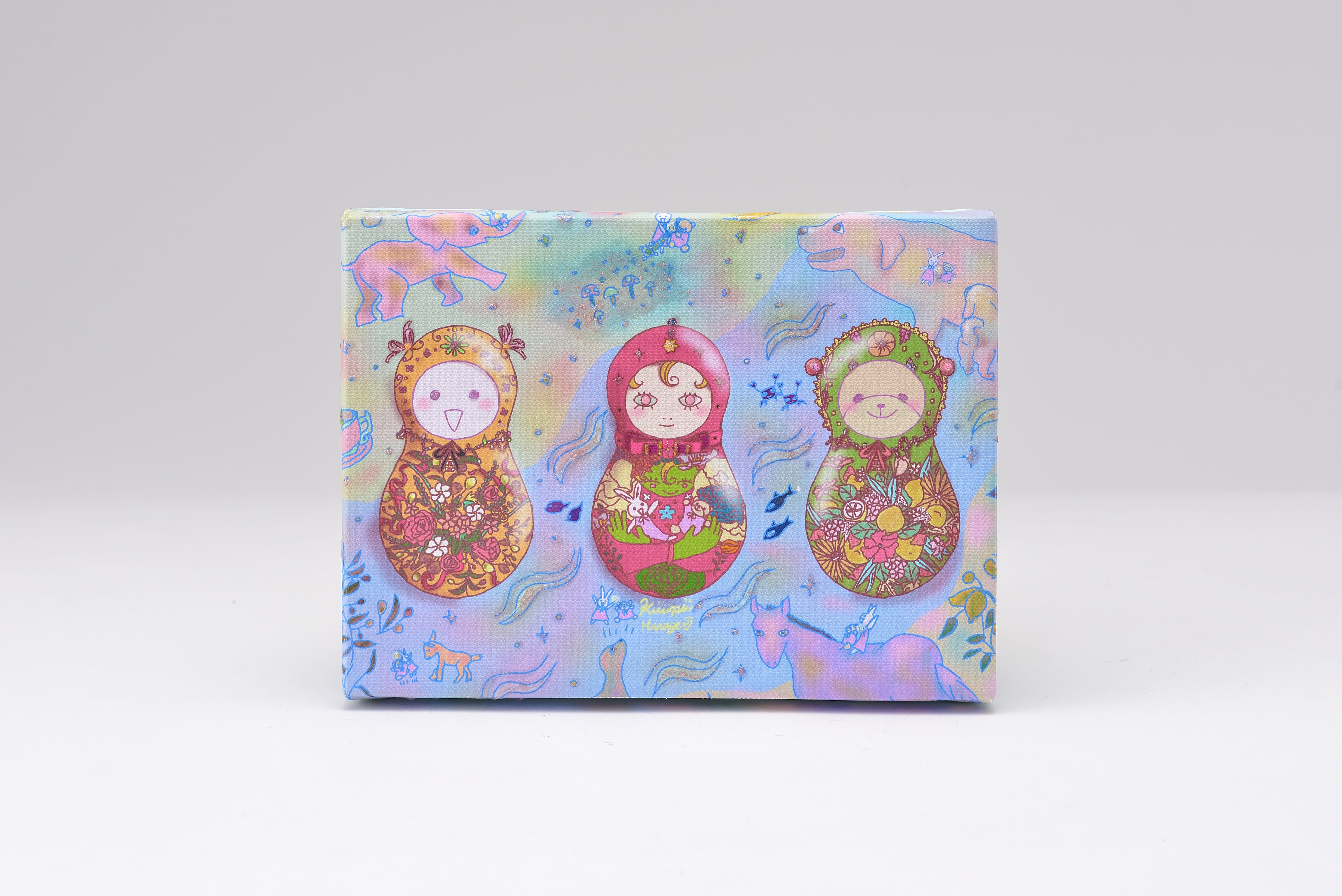 Artist : クピマネ 最奥の入れ子に宿るのは、その人形が秘めた夢。 夢が尽きない限り、福は必ず訪れる――そんな祈りを込めた作品です。 技法/デジタルプリント(ホワイトマットキャンバス)、グロスメディウム+アイシャドウ塗布、ビーズ装飾