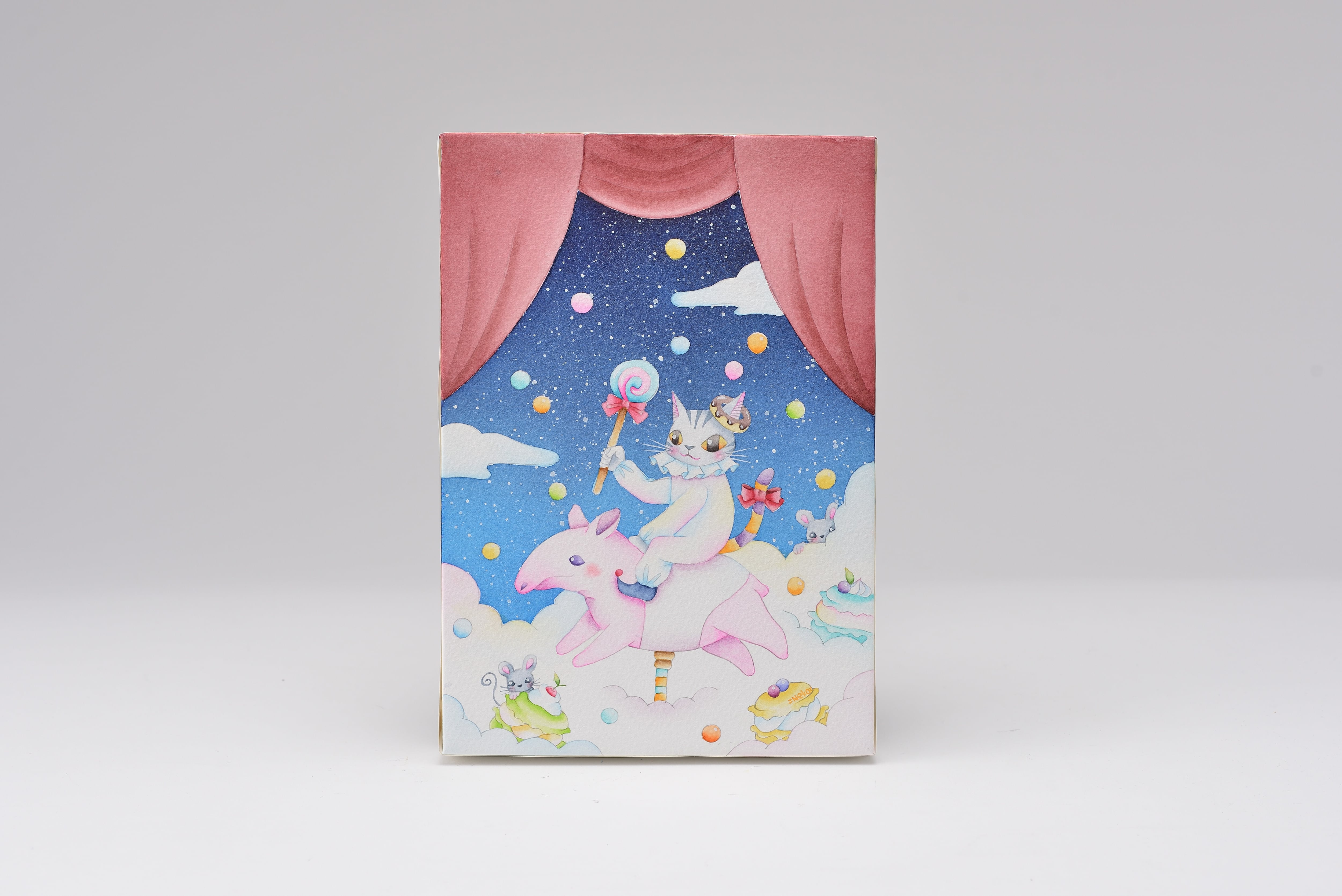 Artist : しまだねこ 飴玉が空からこぼれ落ち、ふわふわ綿雲の上には甘いマカロン。 小さな頃に憧れたお菓子な世界。 そんな夢を彼等はあなたに見せてくれることでしょう。 技法/水彩紙に透明水彩・胡粉・顔彩