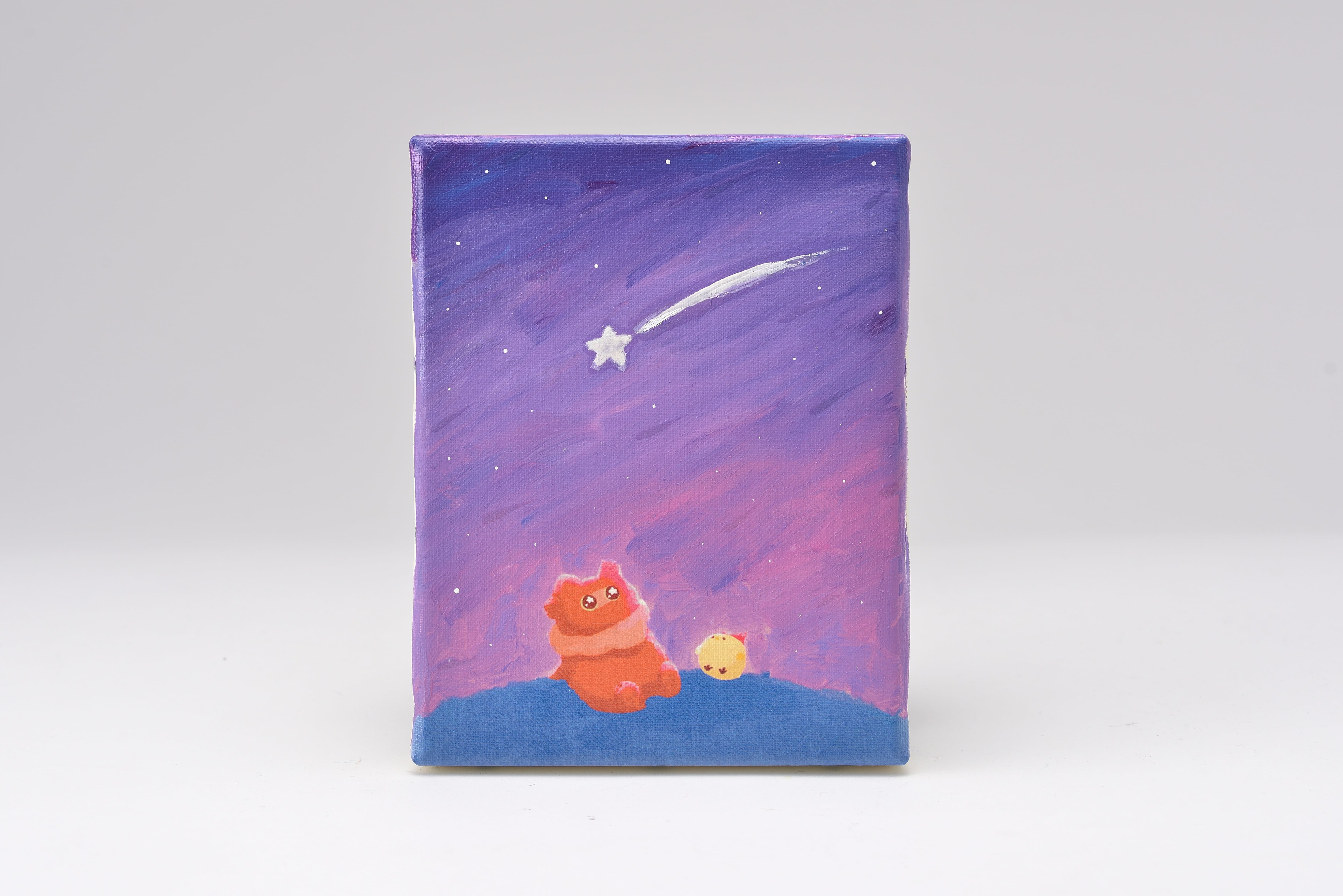 Artist : みおとみ えりか いなちゃん(茶色のキャラクター)ととりさん(黄色のキャラクター)が流れ星を見ている様子を切り取りました。 ブラックライトを当てると流れ星が浮かび上がります。 技法/デジタル、アクリル絵具、蛍光絵具