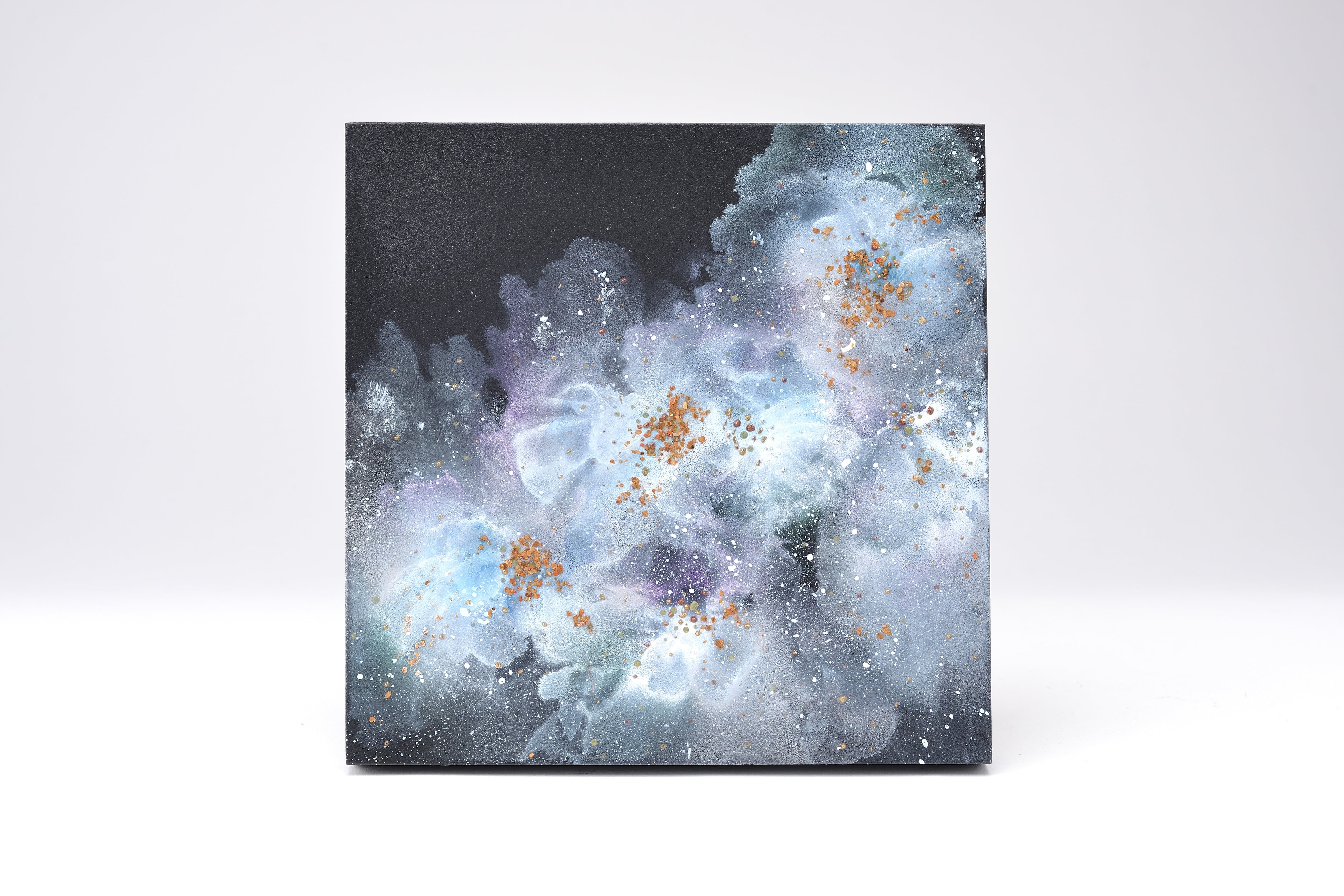 Artist : Ayumi Okuno "澄んだ夜空に、ふわりと咲いた氷の花。 アルコールインクの艶やかな煌めきが重なり合い、 静けさの中に広がる、凛とした幻想世界を描きました。 光の角度で表情を変えるこの一枚に、 あなただけの「冬の物語」"