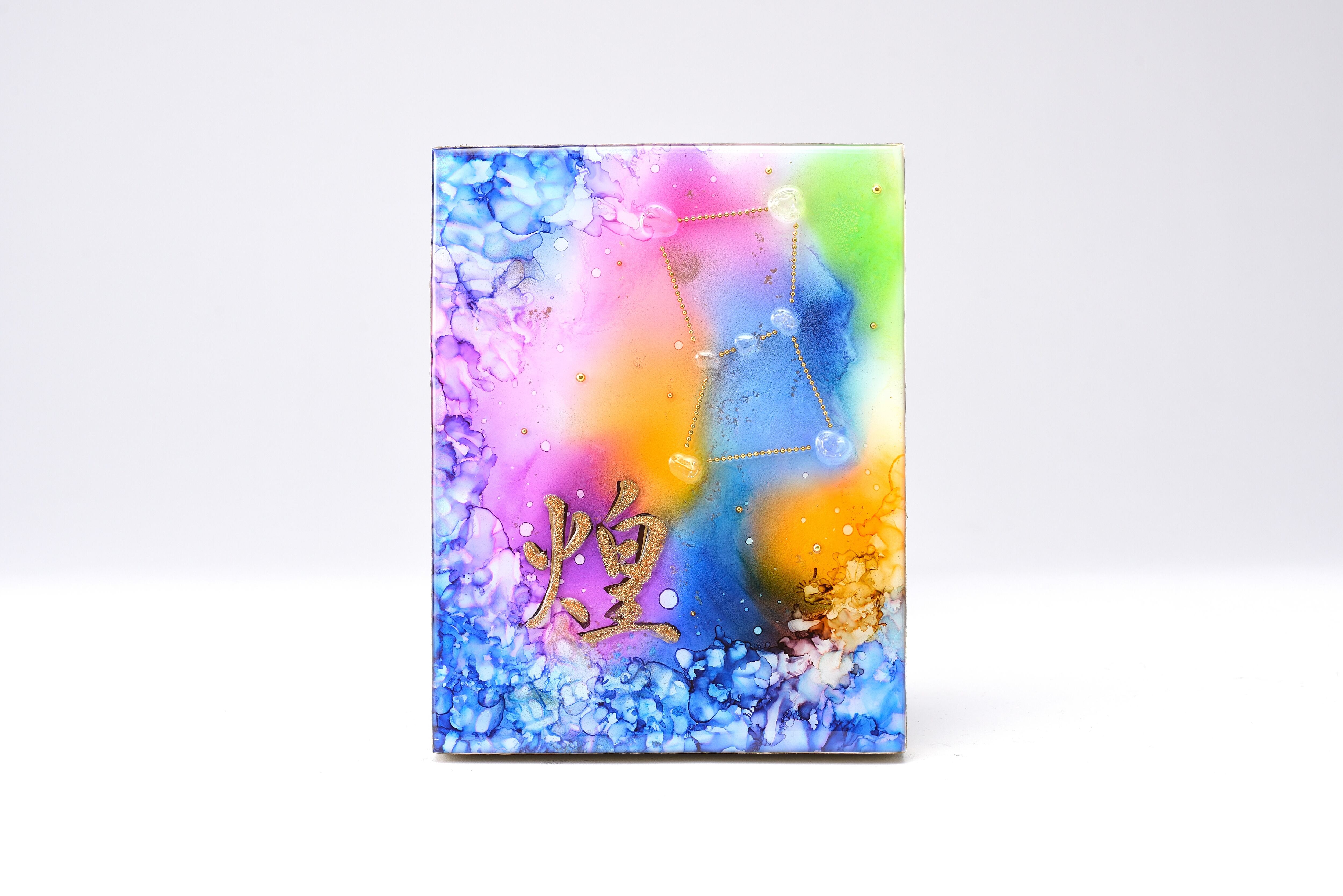 Artist : 音彩 "冬は街や夜空がキラキラしたイメージがあるので、「煌」の文字を書きました。アルコールインクでは森の中から見上げるオーロラと街の光をイメージして描きました。"