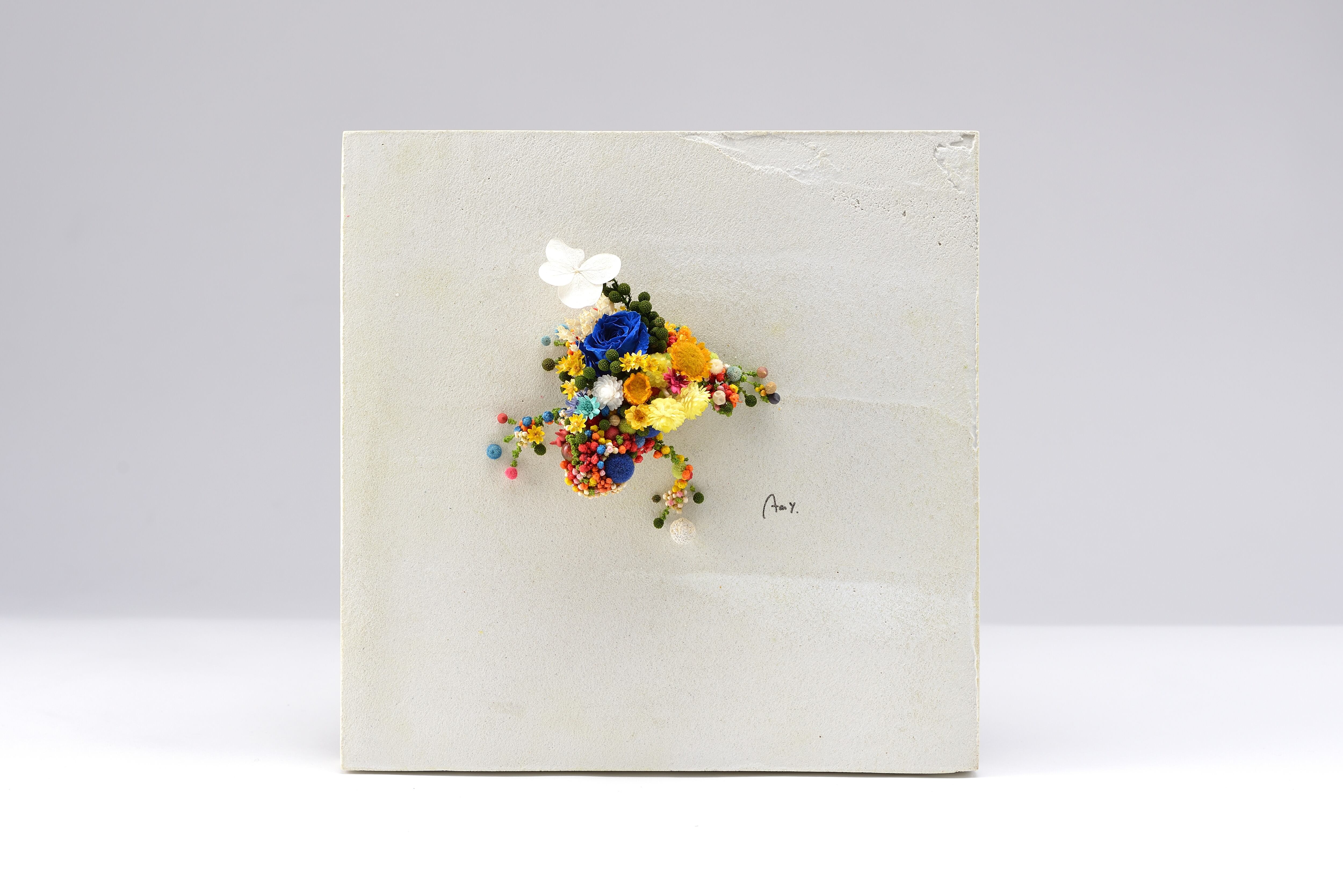 Artist : Libertas labo Any 活動初期の頃から数多く制作したモチーフ。 制作を重ねる毎に立体感を増し、今ではボードの外側へと現れた。 技法/ボード:木材・モールテックス 花材:ドライフラワー・プリザーブドフラワー