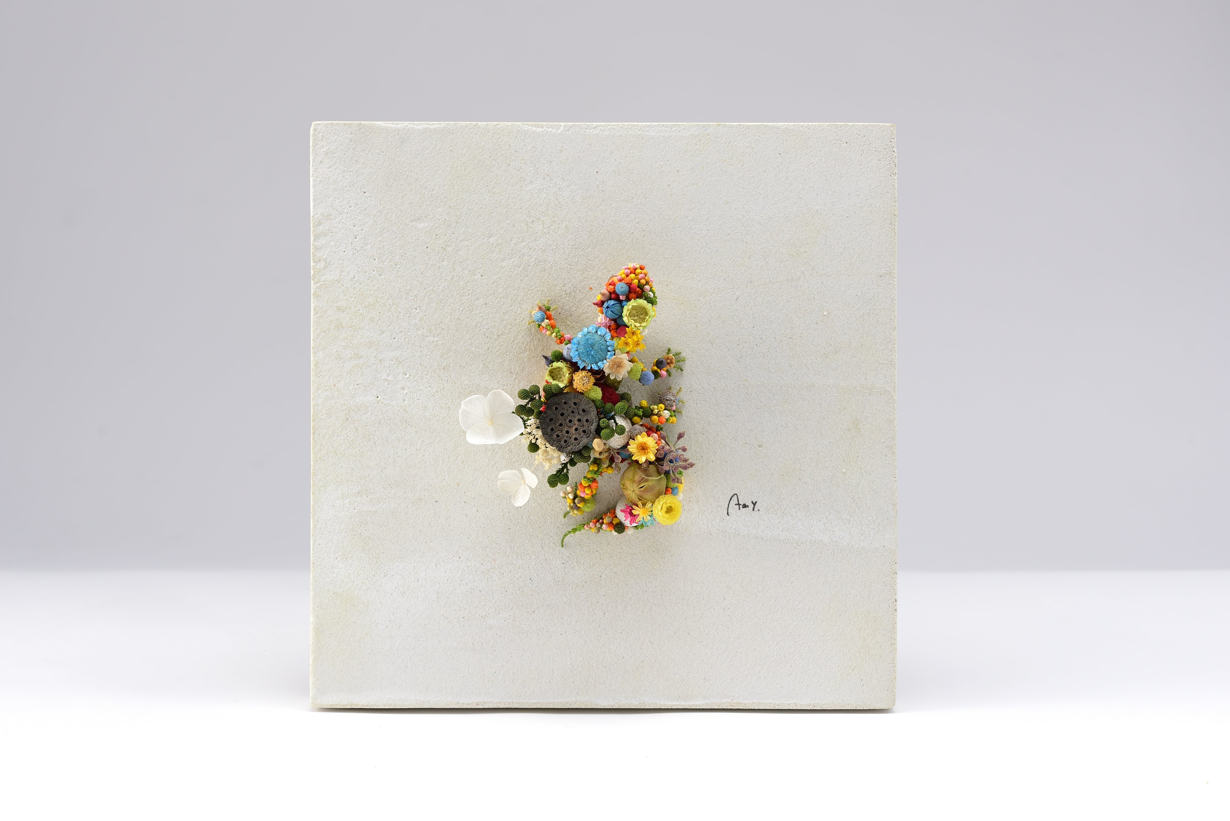 Artist : Libertas labo Any 頭をもたげたレオパードゲッコーを、 様々なドライフラワーで表現した作品。 技法/ボード:木材・モールテックス 花材:ドライフラワー・プリザーブドフラワー