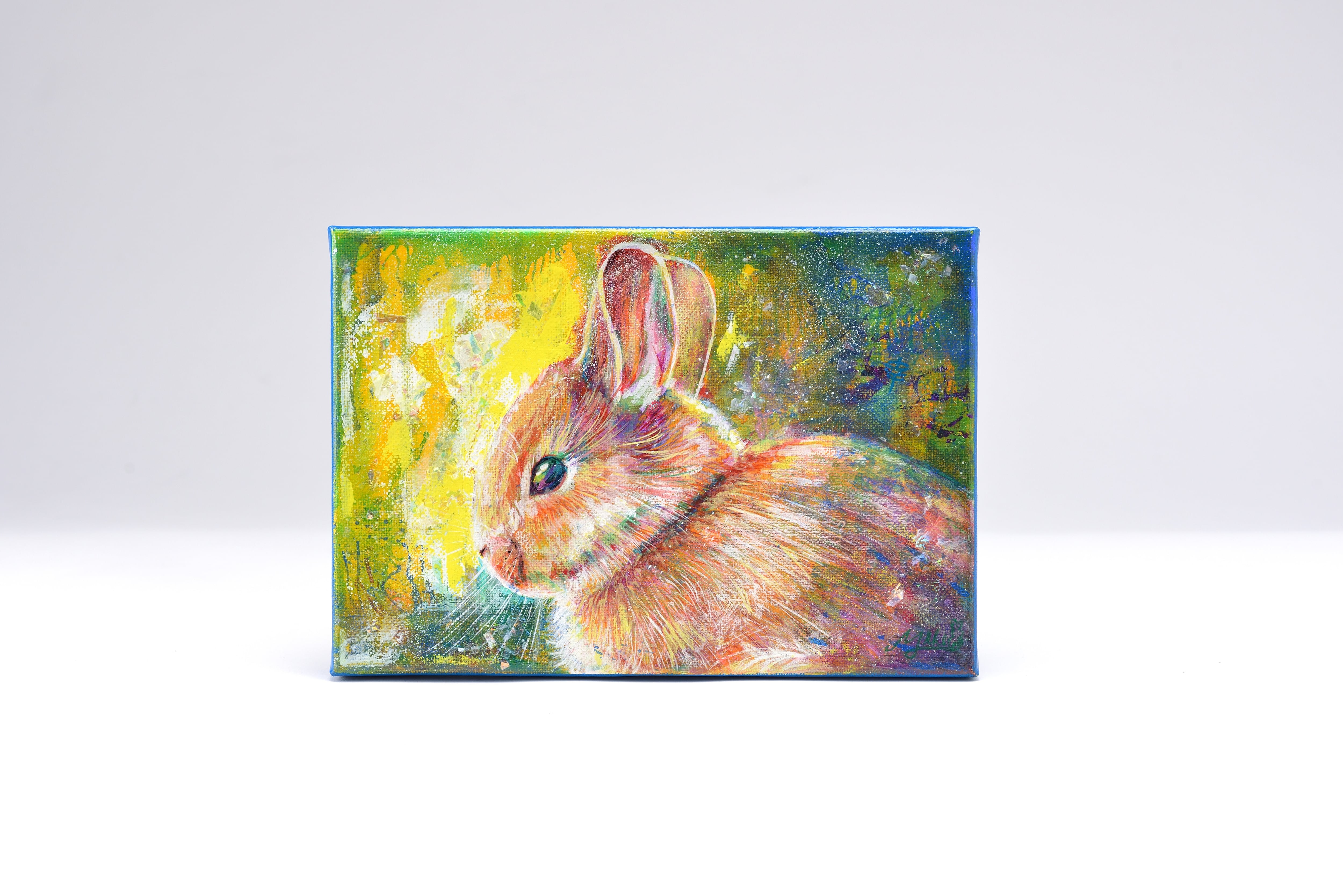 Artist : Miki うさぎが不思議な空間を散歩している様子を描きました。 暗闇の中でも必ず光がある。 今の自分と重ねて想いを込めた作品です。 色んな角度から見て頂けたら嬉しいです。 技法/アクリル画