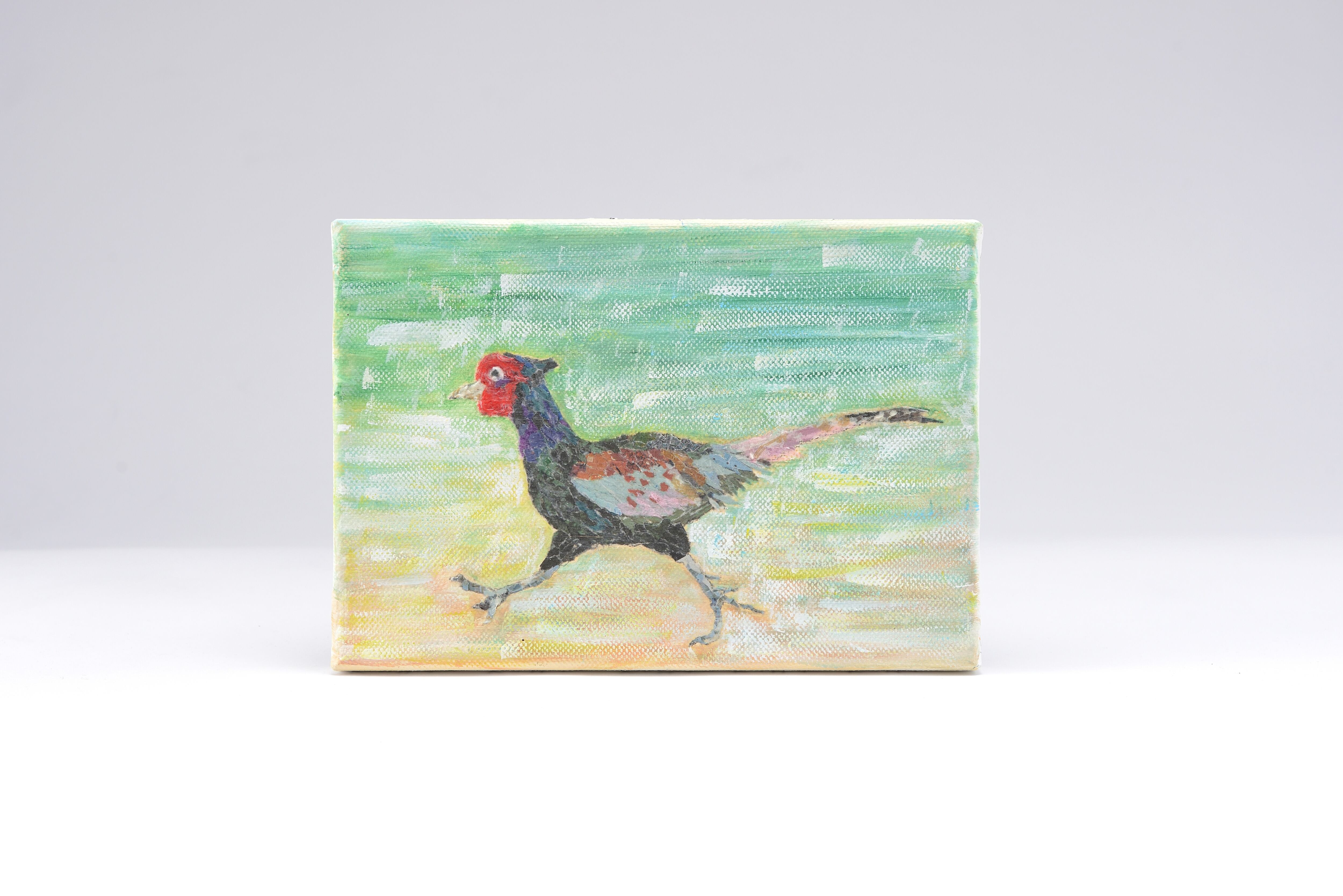 Artist : NAO キジの勇姿より走らせた方が面白いと思い走る姿をちぎり絵にしてみました キジは新聞紙やその他紙類のカラー面のみを使用しています 紙本来のカラー面を出すので色は塗っていません (バックの背景のみ塗る) 技法/ちぎり絵 アクリル