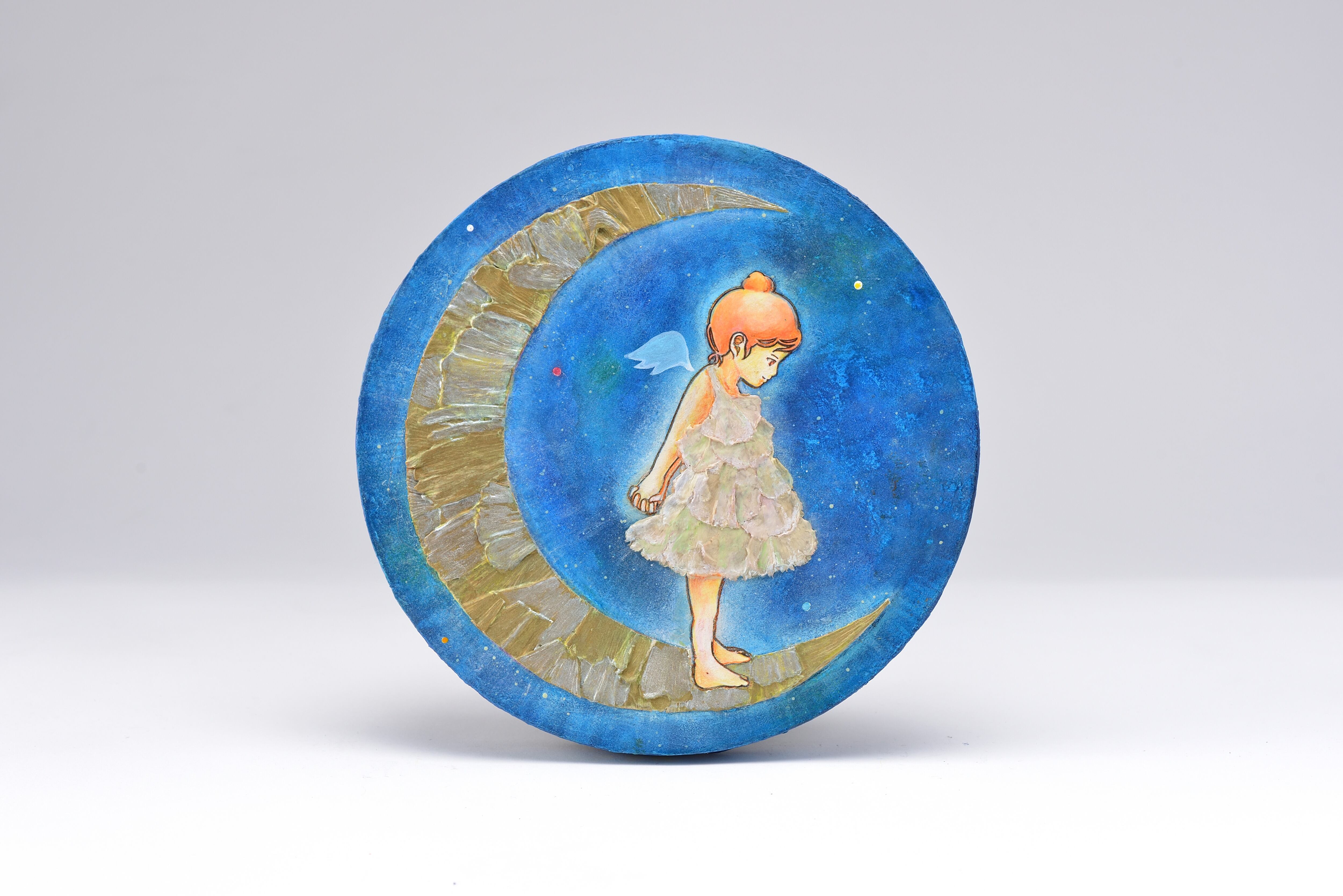 Artist : nenecco(ネネコ) 二部作として向かい合わせの三日月を描いています。 こちらは「見守る月」として、私の特徴でもある「ドライフラー」を画材として使い 誰にも平等に照らす月を表現しました。 技法/ミクストメディア
