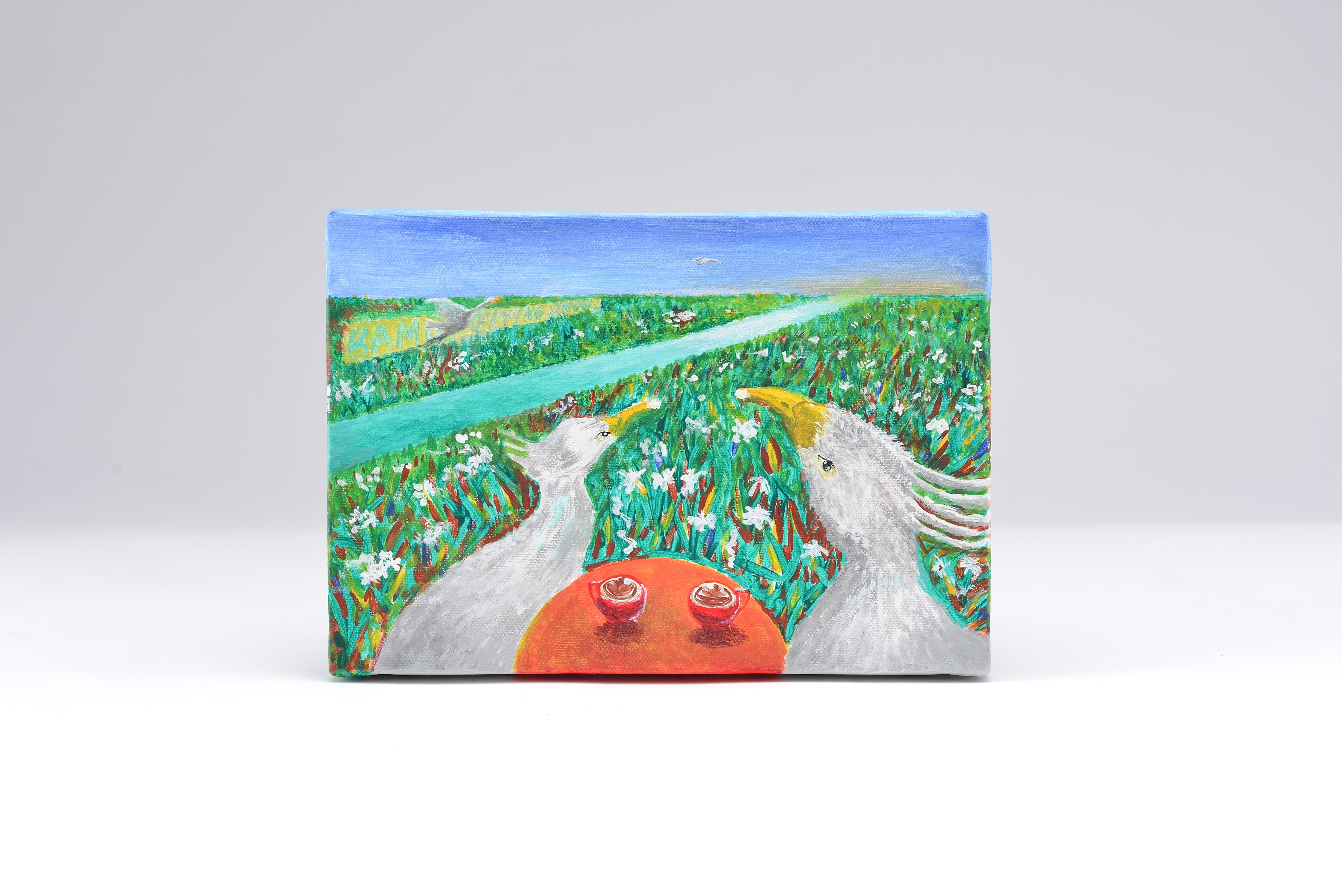 Artist : Shinzie 鳥の国のFLYINGSCHOOLでは、 つがいが今日も仲睦まじく子どもを見守っています。 お互いクチバシにミルクを付けてほのぼのとした光景に心が和みます。 キャンバス側面の隠れ鳥も見つけてみて下さい。 技法/アクリル、カンヴァス(SMサイズ)