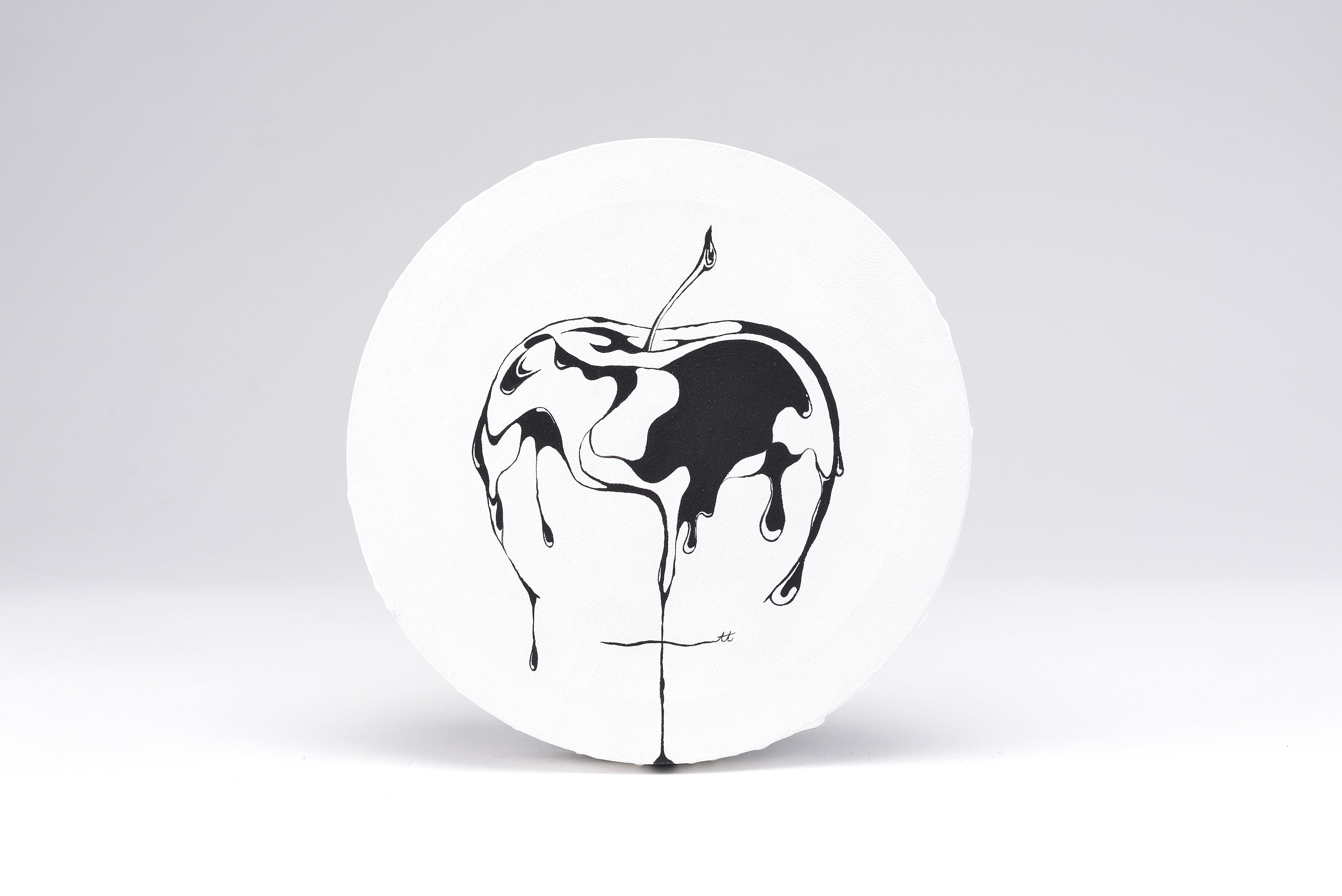 Artist : t.t 輪郭は保たれているのに、 中身は静かに流れ落ちていく。 この林檎は“崩壊”ではなく、 “変化”の瞬間。 止まって見える時間の中で溶け合い、 純粋さと誘惑の境界を曖昧にする。 技法/アクリル絵具、水性ペン