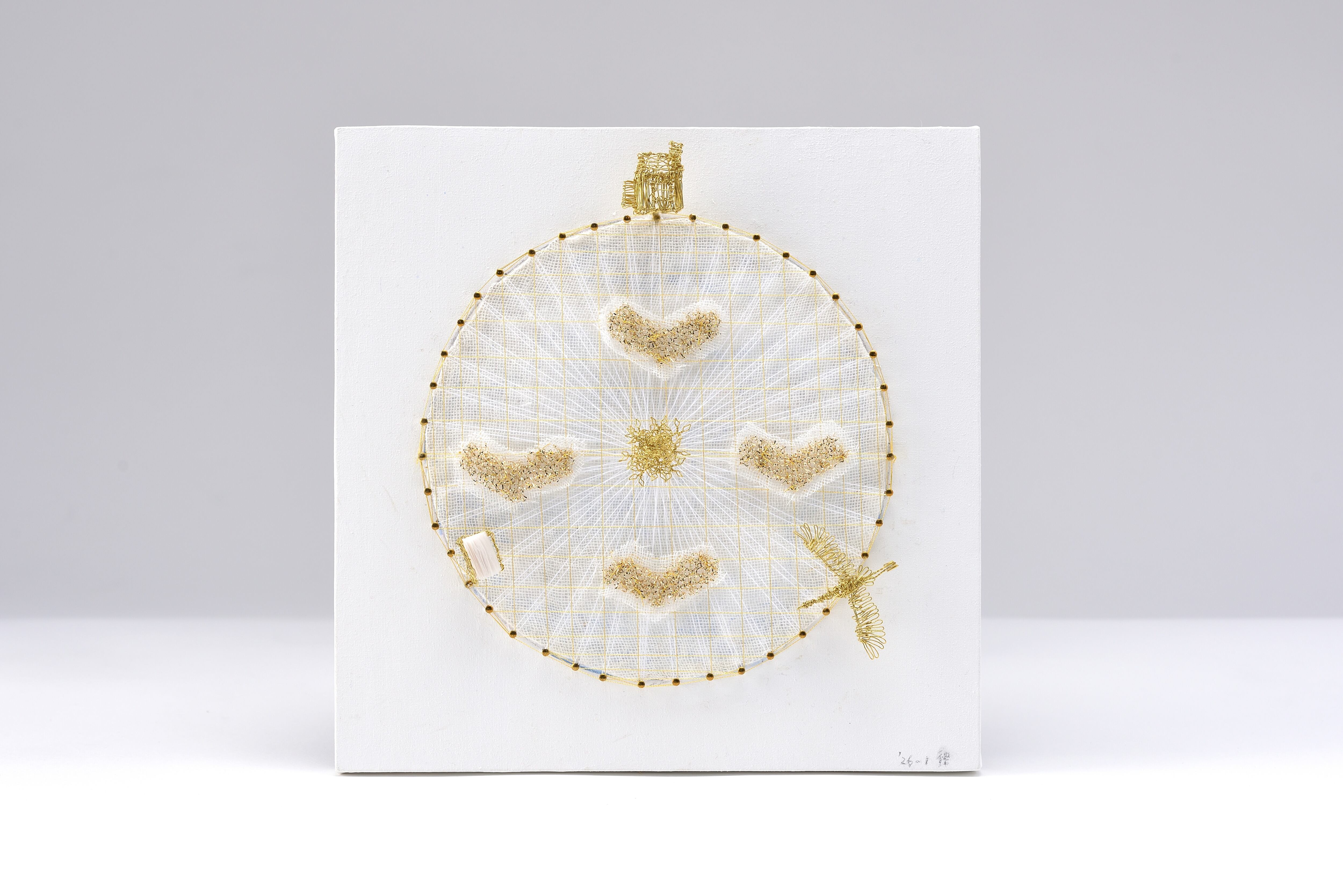 Artist : うちはし りつこ 真鍮釘43本 中心:樹 3つのモチーフ:ホーム、鳥、本 4つのハート(心臓として) E = Earth 目に心に留まれば幸いです 技法/ワイヤーワーク、ストリングワーク