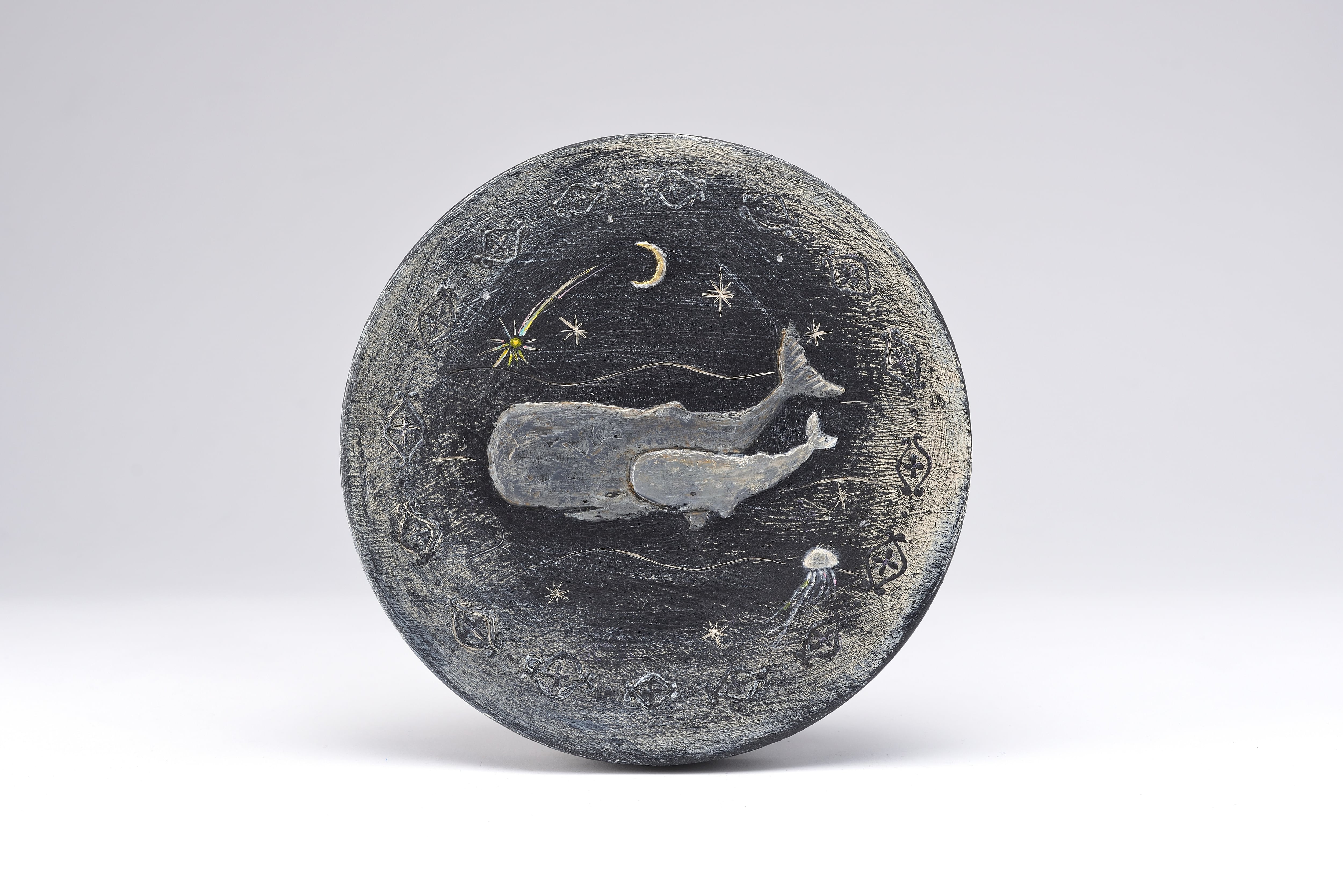 Artist : 海ノたまき 海の生き物や月や星、好きなものをギュッと詰めました。 版画や木彫りのような作風にならないかな、と、盛り上げ材や彫刻刀などを使い色々試してみた作品です。 技法/アクリル画/モデリングペースト ※こちらの作品は非売品です。 (システムの都合上、仮の金額が記載されています)