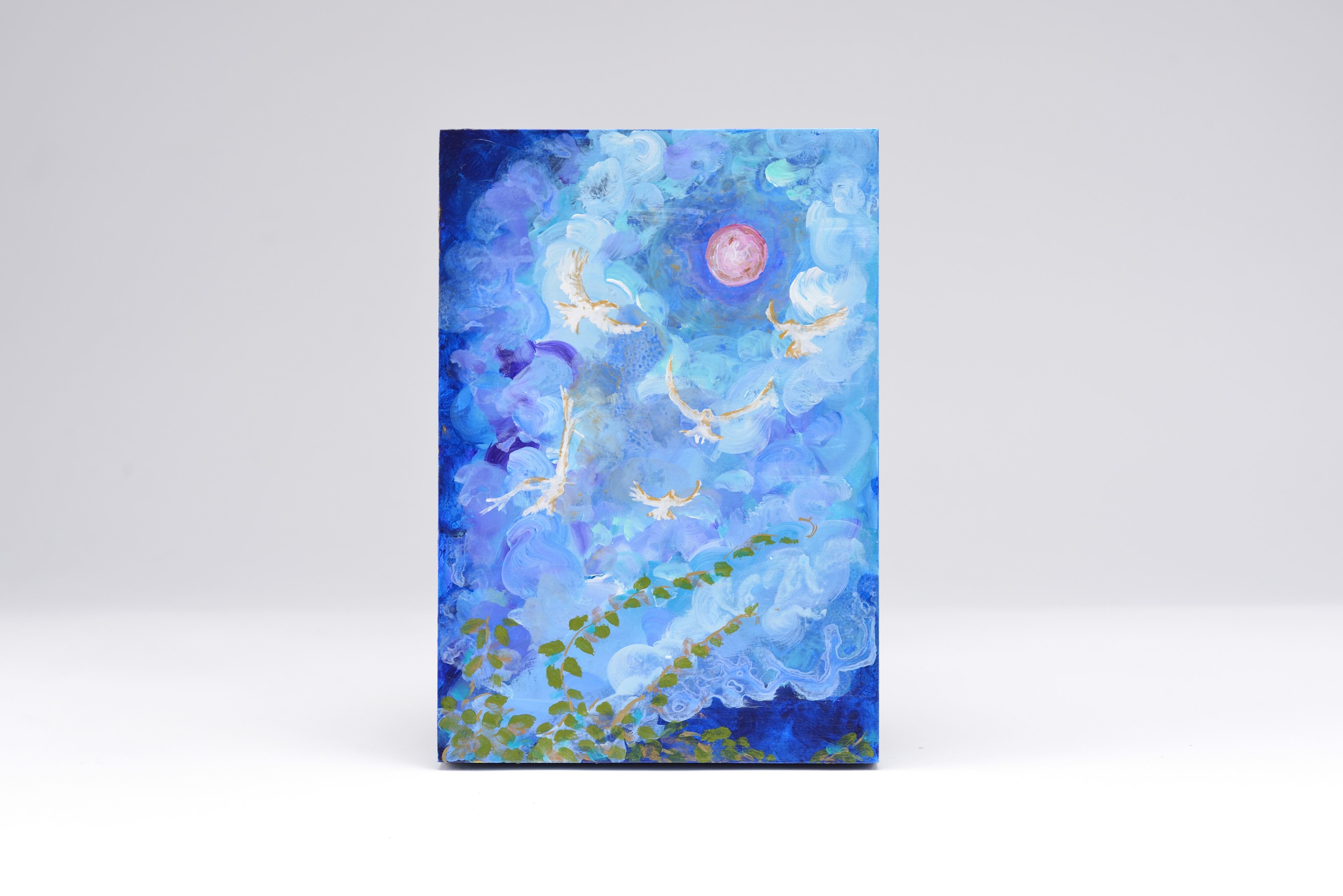 Artist : 遊夢(Yu-Mu) 今年初めてみた月と月にかかる雲のコントラストが印象的で、 絵にしてみたいと思い出来上がった作品です。 鳥たちが月の光を楽しんでいる姿を宴として表現しました。 画面内に収まらなかった星は側面に描きました。 技法/アクリル画