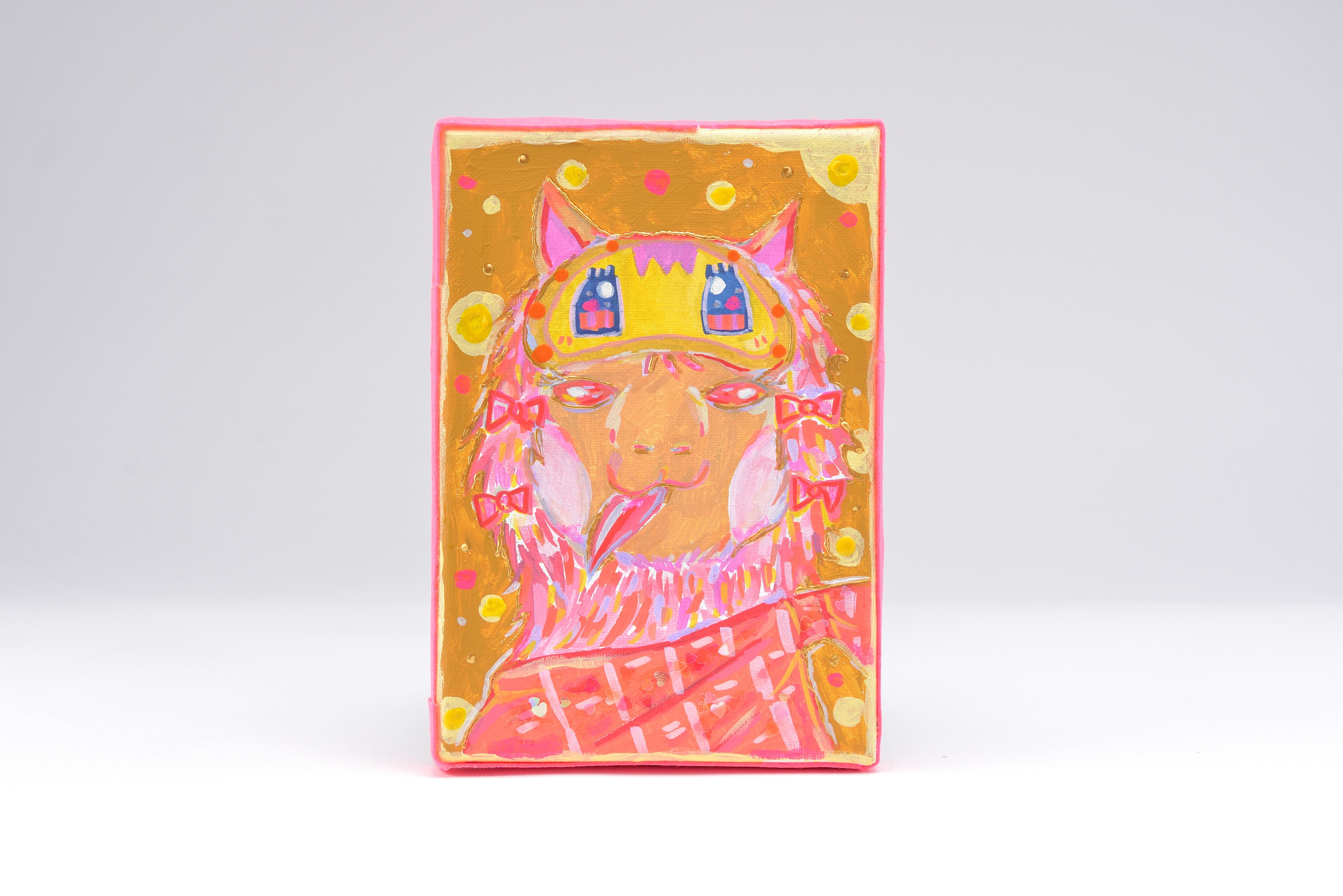 Artist : ふたばりく 金色の線が派手さと愉快さを表現したアルパカさんです。 何を企んでいるのか? 楽しんで頂ける作品になっております。 技法/ボンド、アクリル絵の具、フェルト、アクリルマーカー