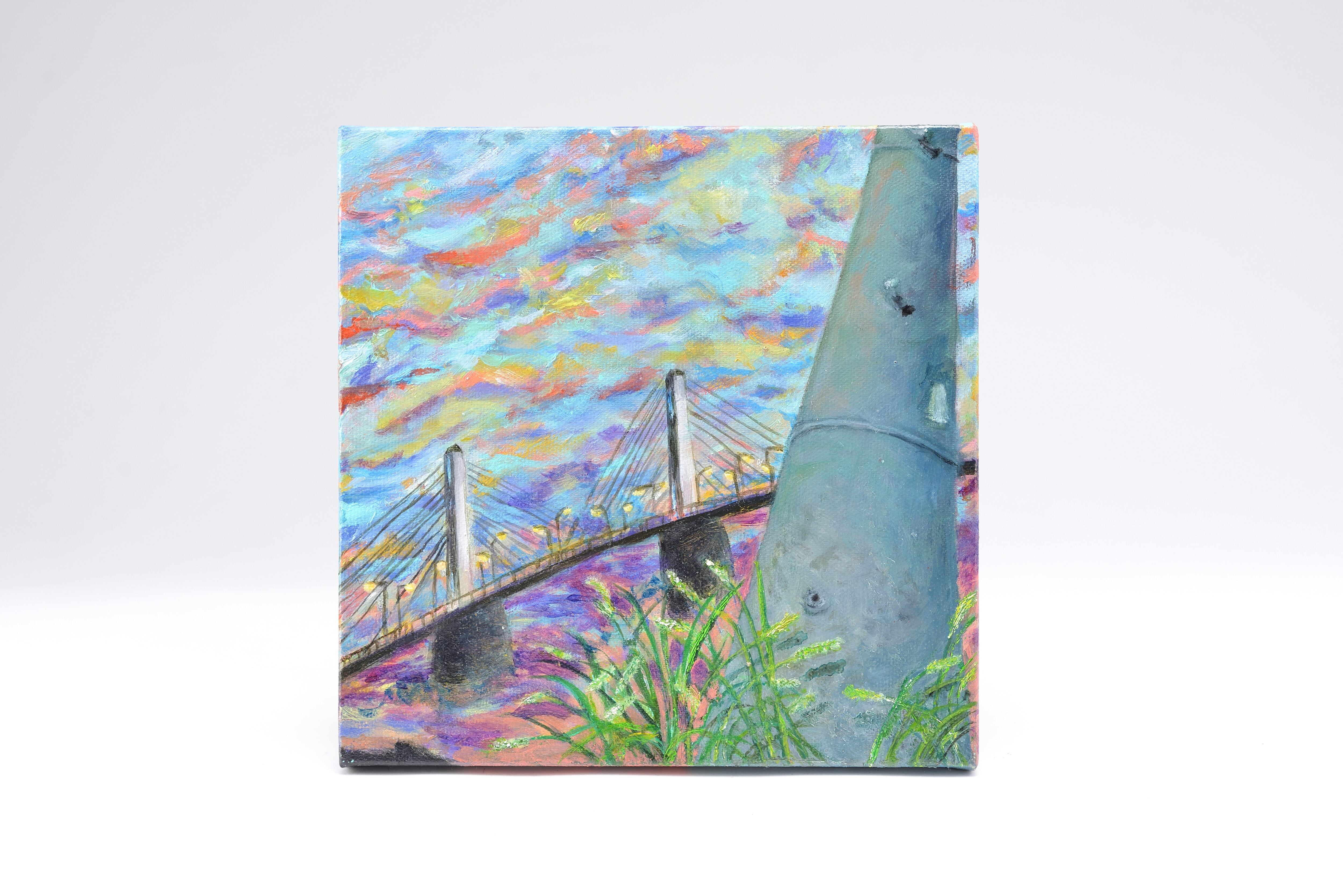 Artist : 千尋 夕方の日の沈む頃から、夜までの間の空模様がとても好きです。 人工物と自然の草が気持ちのいい、風を感じるアクセントです。 技法/油絵具